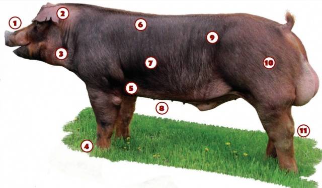 Дюрок предава името на потомците, вече като порода, цвят, бърз растеж, дълбоко тяло, широки рамене и мощни шунки и спокойно разположение.