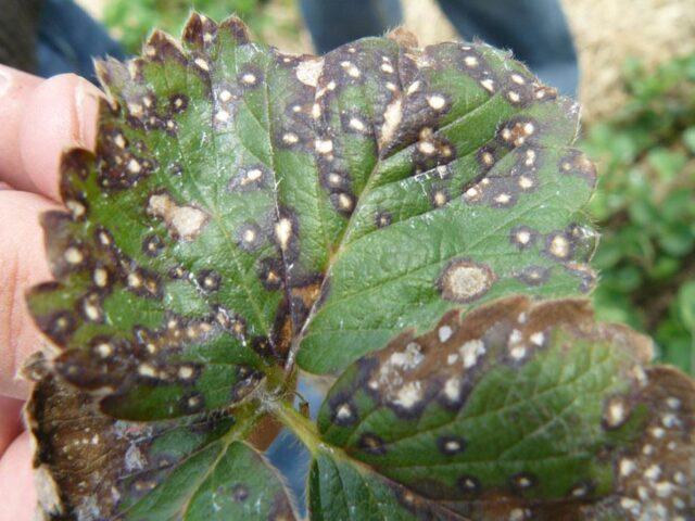 Първите симптоми на гъбично заболяване се появяват като жълти петна по листата, които постепенно изсъхват и отпадат. За борба с патологията, пръскането с "Kuprozan", "Ftolan" се извършва в момент, когато бъбреците все още не са започнали да растат.