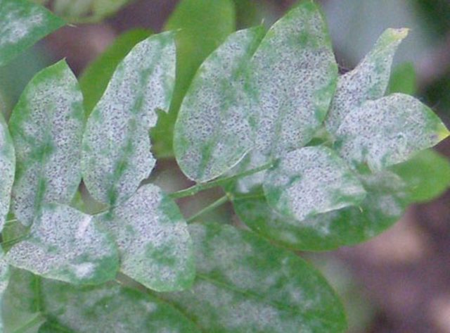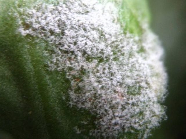 - образуването на бял цвят върху листната плоча, плодовете, стъблото;