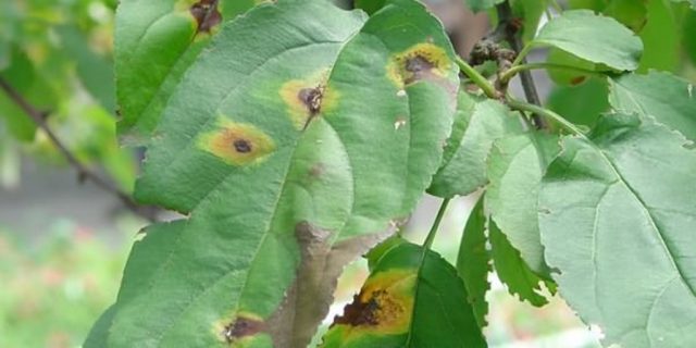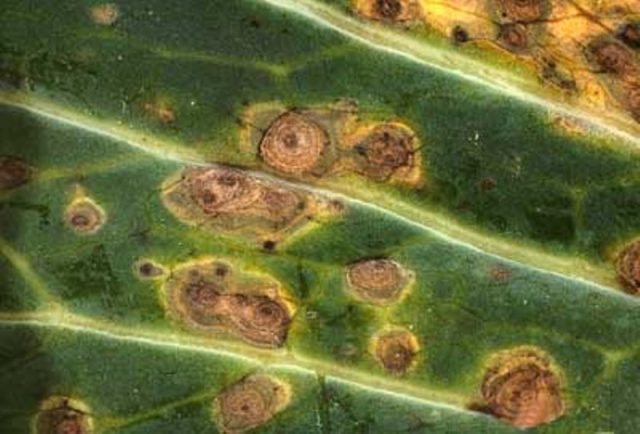 Можете да идентифицирате болестта от външната страна на листовата плоча. В началния стадий на заболяването върху него се появяват малки тъмнокафяви петна, които в крайна сметка се разпространяват по цялата листна плоча.