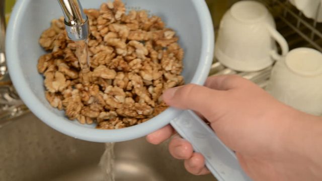 Следователно измиването на ореховите ядки, ако продуктът се продава белен, трябва да бъде по-внимателно: