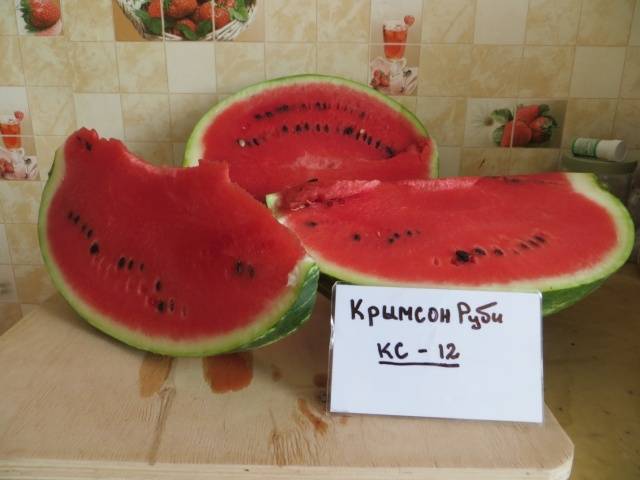 Ранно узряващият високодобивен сорт диня се разпространява от японската компания Sakata. Динята Crimson Ruby f1 е включена в Държавния регистър от 2010 г. като култура за отглеждане в региона на Северен Кавказ, препоръчана за търговско производство. Сортът се отличава със силен растеж на основния камшик и листа, които приютяват плодовете от лъчите на парещото слънце. На хектар се поставят до 5,5 хиляди растения Crimson Ruby, със стъпка 1,5 - 0,7 m, добивът е 3,9-4,8 kg / m2... Сортът е устойчив на суша, не е податлив на фузариум, има имунитет срещу брашнеста мана, антракноза и такъв често срещан вредител като листни въшки. Плодът узрява след 65-80 дни от развитието на растенията, теглото на дините Crimson Ruby f1 достига 7-12 кг.