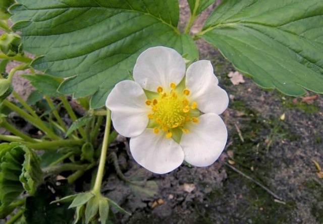Белите пъпки на сортовете градински ягоди са големи (венчелистчетата не се навиват), привличат вниманието отдалеч (вижте снимката). Цветята на фойерверките са двуполови, което има положителен ефект върху залагането на плодовете.