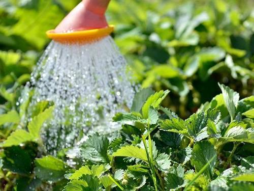 Честотата на поливане зависи от състава на почвата. При рохкава почва процедурата е по-честа. Глинестата почва задържа влагата по-дълго. В такива райони можете да поливате след 1-2 дни. Преди цъфтежа ягодите могат да се поръсват веднъж седмично. С появата на дръжки водата се подава в корена. Подредете капково напояване. Възможно е да излеете вода от маркуч по пътеките, но има опасност от излужване на корените. След поливане, за да се задържи влагата, почвата се мулчира с дървени стърготини, слама или торф.