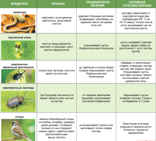 Вредителите причиняват голяма опасност за ягодите. Начините за борба с тях са показани в таблицата. Можете също да добавите към това охлюви, охлюви и мравки, които ядат плодове. За да се борят с врага, те използват народни методи. Загладете копривата на градинското легло, поръсете сол или смлян лют пипер.