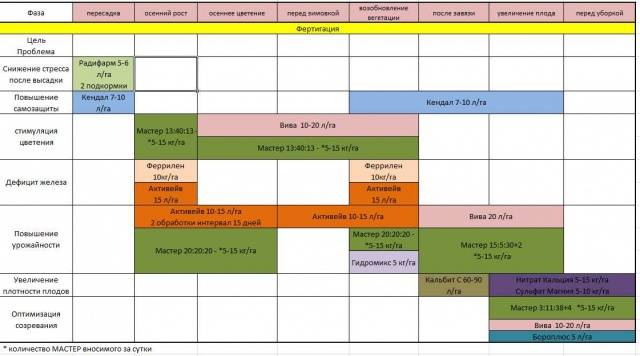Сортът Holiday се нуждае от повече от органично торене. В началото на пролетта, преди цъфтежа и след прибирането на реколтата, се въвеждат минерални комплекси, съдържащи азот, фосфор и калий. Времето за приложение и имената на лекарствата са показани в таблицата.