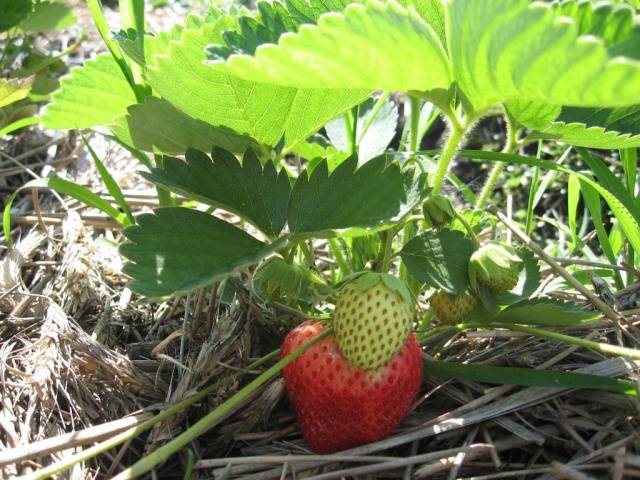 - Цветните дръжки от този сорт са разположени под листата, така че плодовете са надеждно скрити от слънчевите лъчи и не се пекат в жегата. Цветята са доста големи, двуполови, следователно тази ягода не се нуждае от опрашител, единствен от всички късен сортове. За да не се замърсят плодовете и да не наранят земята под храстите, трябва да мулчирате със слама или по-добре с борови иглички.