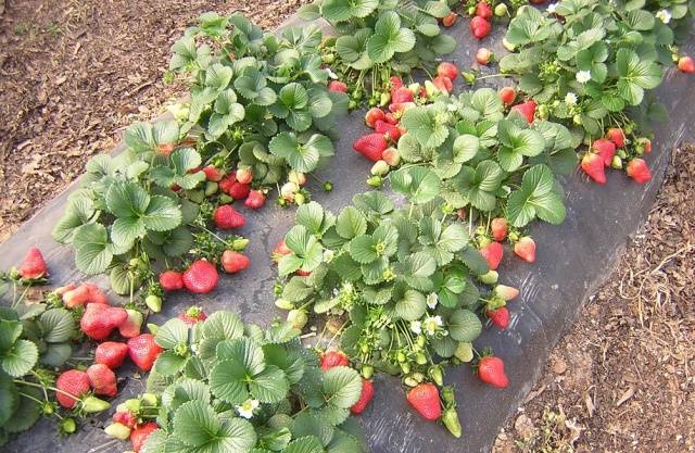 Черният нетъкан текстил е подходящ и за мулчиране. Ягодите се засаждат директно в дупките, направени на мястото на дупките. Единственият недостатък на този метод за засаждане на ягоди е, че дъщерните магазини няма къде да се вкоренят.