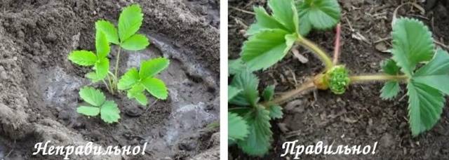 При засаждането трябва да се обърне специално внимание на сърцето: то не трябва да се погребва. Снимката показва как правилно да засаждате ягоди.