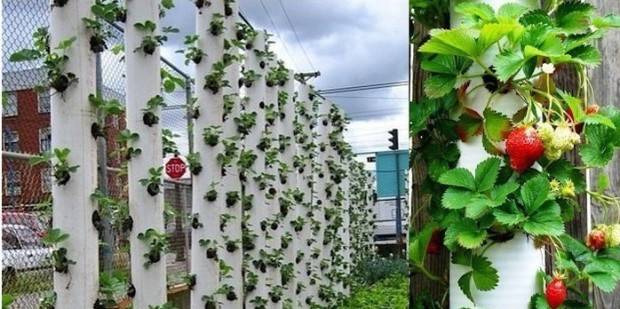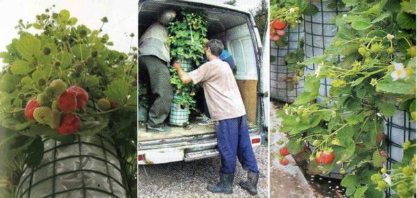 Има и друга технология, подобна на горния метод за отглеждане на ягоди. Единствената разлика е, че се основава на използването не на тръба, а на строителна мрежа. Навива се на руло, като фиксира краищата. Такава "спукана" тръба трябва да бъде обвита с полиетилен, след което напоителният маркуч трябва да се вкара вертикално в конструкцията. След това трябва да направите дупки във филма и да засадите ягоди. Характеристика на тази технология е способността да се създава структура с голям диаметър.