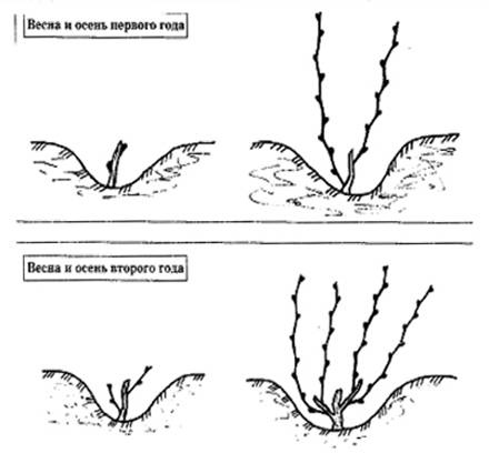 При благоприятни условия до есента на първия вегетационен период на гроздови храсти узряват 1-2 (понякога повече, но рядко) издънки, развити и добре узрели, дълги около метър и около 6 мм в диаметър. По време на есенната резитба се отстранява само неузрялата част от лозата, останалите операции по нея ще се извършват през пролетта. Това се прави така, че когато издънките измръзнат или изсъхнат през пролетта, ние нарязваме върховете им в необходимите 2-4 очи и не губим напълно. Слабите лозя се отстраняват под корена на гроздовия храст.