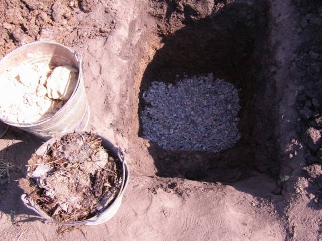 - 5-10 см трошен камък, камъчета или счупена тухла се изсипват до самото дъно - това е дренажен слой. Дренажът е необходим, за да се предпазят корените от влага.