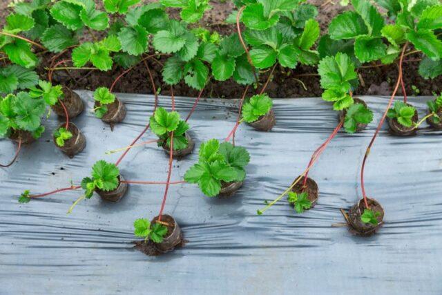 - Растенията се нуждаят от ежедневно поливане само веднага след засаждането, преди вкореняване. Средната норма е 2-3 литра вода на 1 m². Веднага щом се появят нови листа, те преминават към седмично поливане, консумирайки 5-7 l / m². При екстремни горещини интервалите се намаляват до 3-4 дни, нормата се увеличава до 2-3 литра на храст.