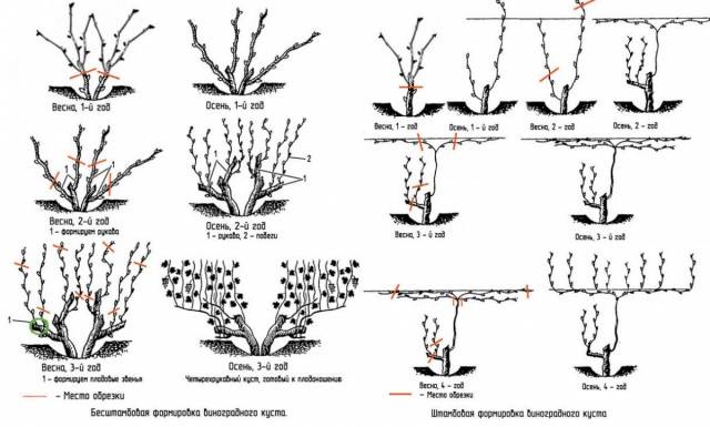 Furshetny гроздови храсти се формират ежегодно, започвайки от втората година. Подрязването се извършва през пролетта преди изтичане на сок, за да се избегне „плачът“ на лозата или през есента след падането на листата, когато лозата е напълно узряла. Издънките се нарязват на 5-8 очи, на храста се оставят 25-30 клона.Резените се правят наклонени с наклон от страната на леторастите, противоположна на очите. Изрязани парчета леторасти могат да се използват за размножаване. За целта те се спускат в изба и се съхраняват там до пролетта.