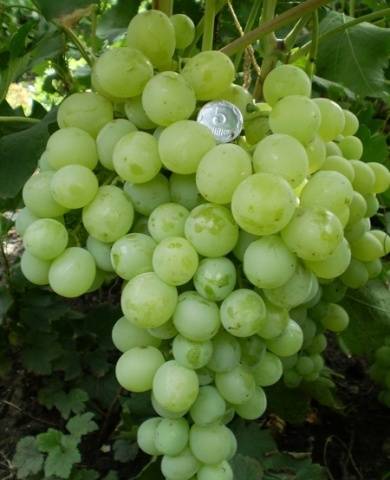 Белите плодове са овални или овално-яйцевидни. Те не са твърде големи, до 4 грама, но има много от тях на куп, така че достига тегло от 1 кг 200 грама. В плодовете няма семена, въпреки че могат да се появят меки зачатъци. Погледнете снимката по-долу, едно зрънце с размер на монета от пет копейки.