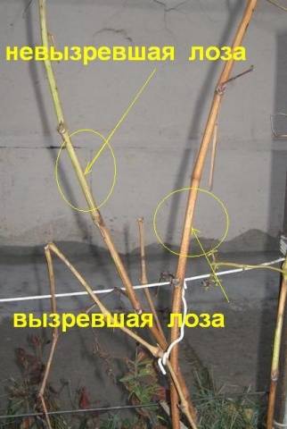 През първата година през есента всички издънки се изрязват в храста, оставяйки само един, най-силният и узрял. Можете да определите готовността на лозата за зимуване по нейния цвят. Погледнете снимката по-долу: узрелата лоза трябва да е кафява. Ако е зелено, значи не е узряло. Просто трябва да се премахне.