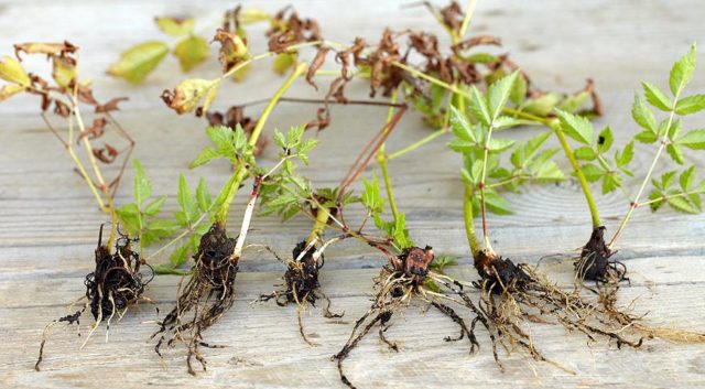 - кореновото гниене се появява от прекомерна влага в почвата или в резултат на механично увреждане на кореновата система. Метод за контрол: поливане на astilba Straussenfeder с вода с добавка на манган и отстраняване на изгнили корени;