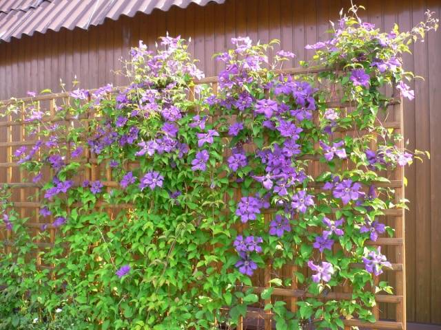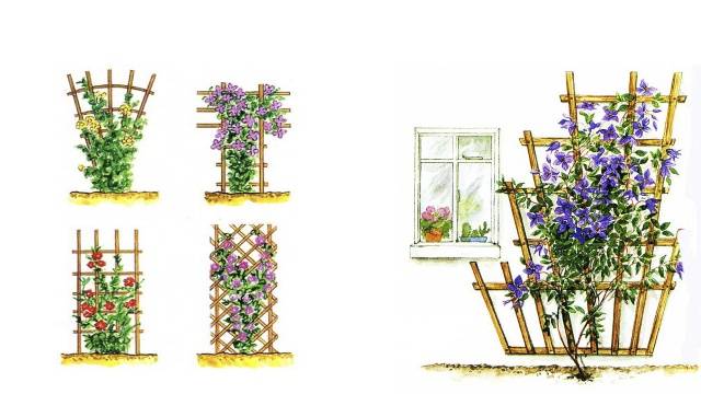 Формата на дървената опора за клематис може да бъде абсолютно всяка. Най-често решетките се правят под формата на решетки, но е възможно да се произвеждат и по-сложни конструкции: вентилатор, многостепенна, прозорец или врата.