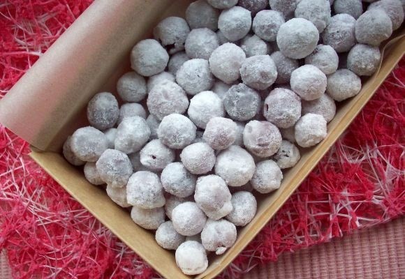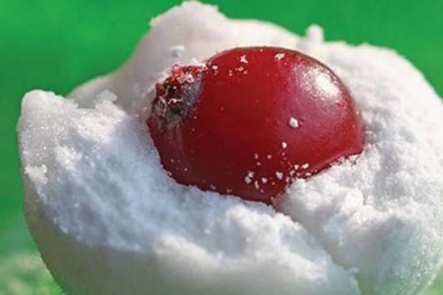- Червените боровинки се отстраняват от сиропа и се заливат с пудра захар.