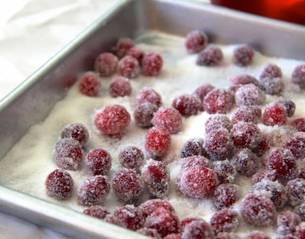 - Захар на прах се поставя върху плосък съд, където червените боровинки се изсипват в малки количества и те започват да овалват всяко зрънце в захар по вече познатата схема.