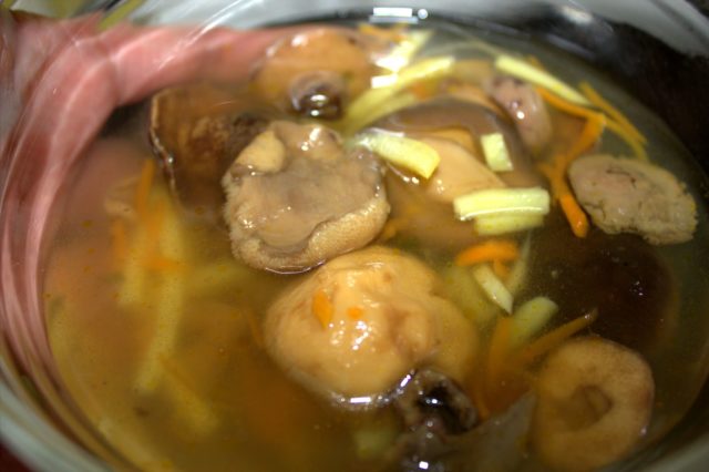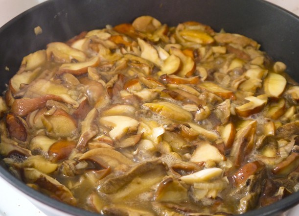 Първичният бульон, образуван по време на готвене, се излива. Сварените гъби се изваждат и се нарязват на няколко парчета. Те отново се поставят в тенджера, заливат се със студена вода и се пристъпва към директното приготвяне на ястието.
