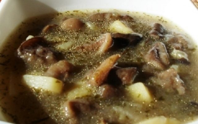Ситно нарязаните гъби се потапят във вряща вода и се варят 20 минути на умерен огън. По това време нарязан лук и моркови се задушават в тиган. Добавят се към готовия бульон, добавят се смесени, осолени, дафинов лист и малко прясно смлян пипер. Добавете копър по желание. Първото ястие трябва да се влива в продължение на 30-40 минути преди употреба.