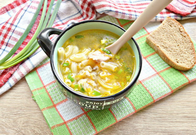 Картофите могат да бъдат заменени с любимите ви тестени изделия. Основното е, че използваните тестени изделия не са твърде големи и няма много от тях, в противен случай първият курс рискува да се превърне в паста. Паяжината и малките рога са най-добри. За 0,5 кг от основната съставка се използват 100 г тестени изделия, някои зеленчуци за пържене и 1,3 литра чиста вода.