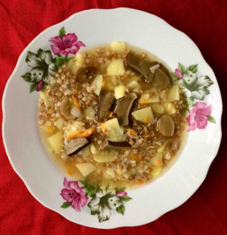 Основната съставка се нарязва на кубчета и се вари половин час. През това време се запържва от 1 морков и 1 глава лук. Картофите, нарязани на барове, пържените зеленчуци и измитата елда се добавят към бульона и се разбъркват добре. По-нататъшното готвене се извършва, докато картофите и елдата са напълно готови. Готовото ястие се украсява с билки и се сервира.