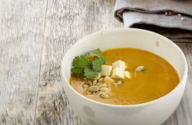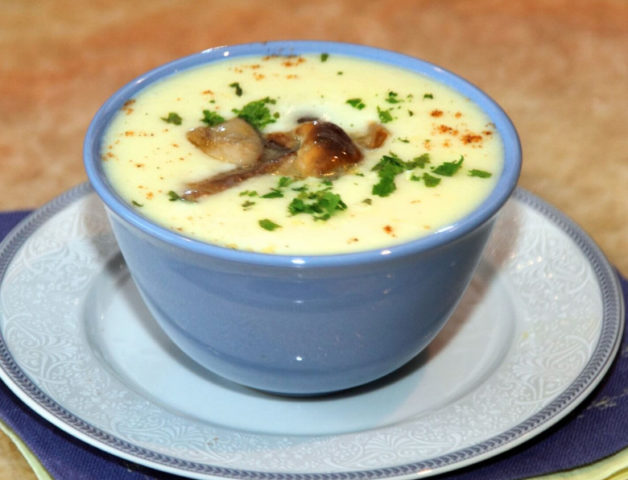 Гъбите се запържват с чесън до светло златисто кафяво. По това време тиквата и картофите на кубчета се варят в тенджера. Когато зеленчуците станат меки, към тях се прехвърлят гъбната смес и малко сол. Изсипете половин чаша сметана в тенджера. С помощта на потопяем блендер всички съставки се пасират, изсипват се в чинии и се сервират, гарнирани с клонче билки.