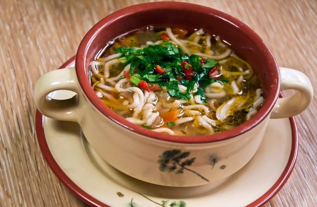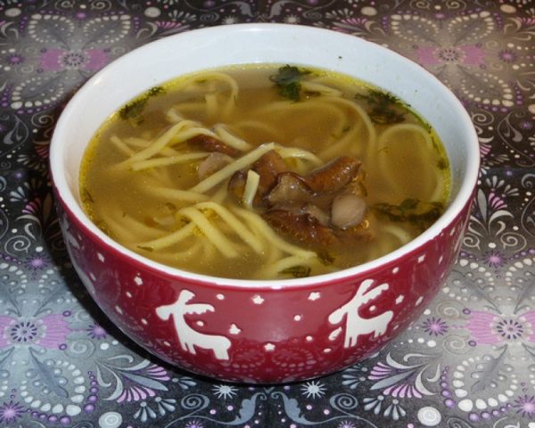 Нарежете гъбите на ситно, сложете ги във вряща вода и варете 10 минути. След това в тях се изсипват 150-200 г фина фиде. Когато макароните са напълно сварени, супата се осолява, сваля се от огъня и се покрива с капак.