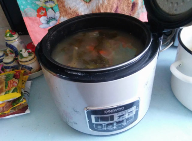 Всички съставки се нарязват на кубчета, поставят се в купа и се заливат с вода. Капакът на уреда се затваря и режимът "супа" се включва за 40 минути. Готовото ястие се осолява на вкус и се сервира на масата за вечеря.